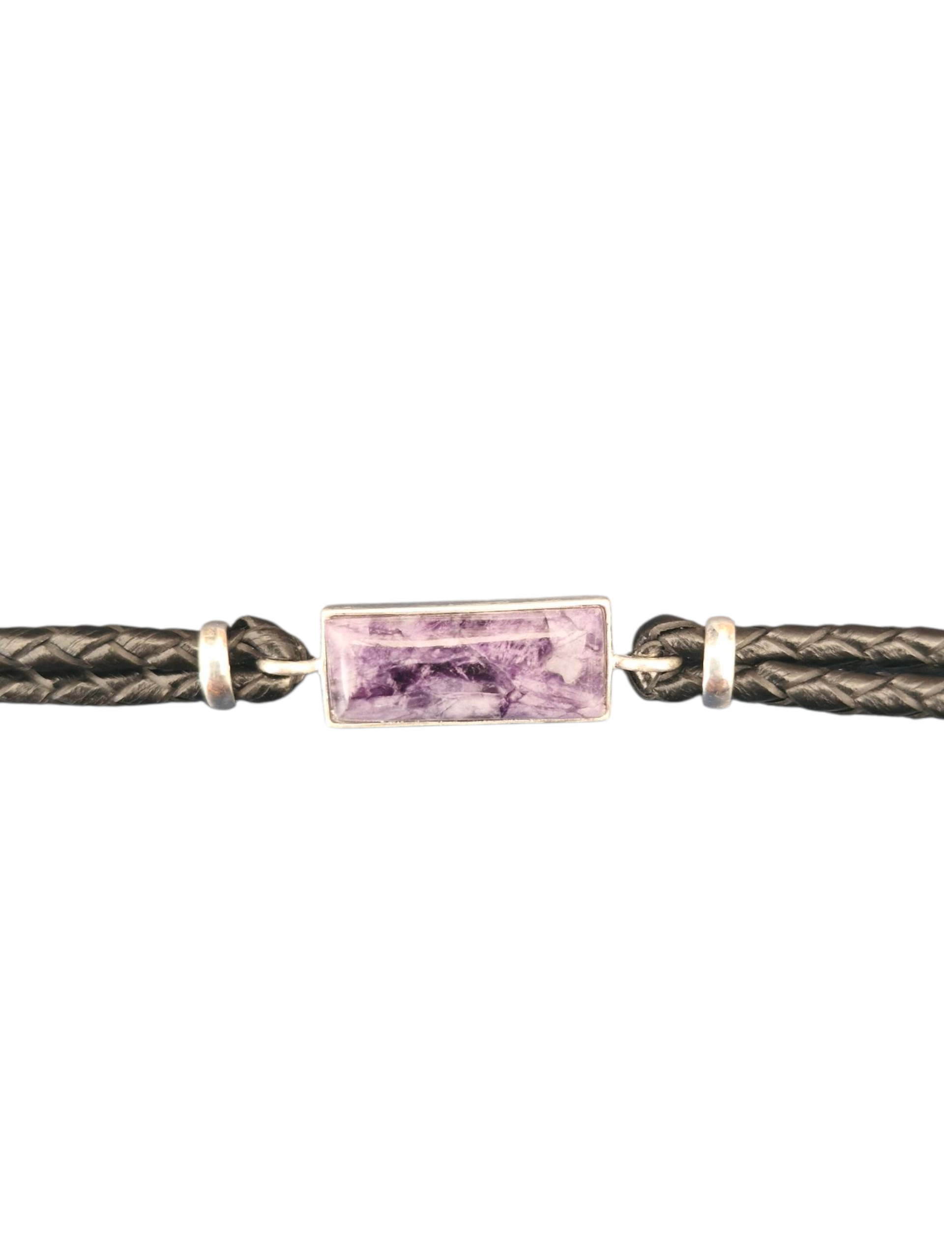 Sterling Silver and Rectangle Blue John stone unisex bracelet with Leather straps. Solid backed and spring ring fastening.