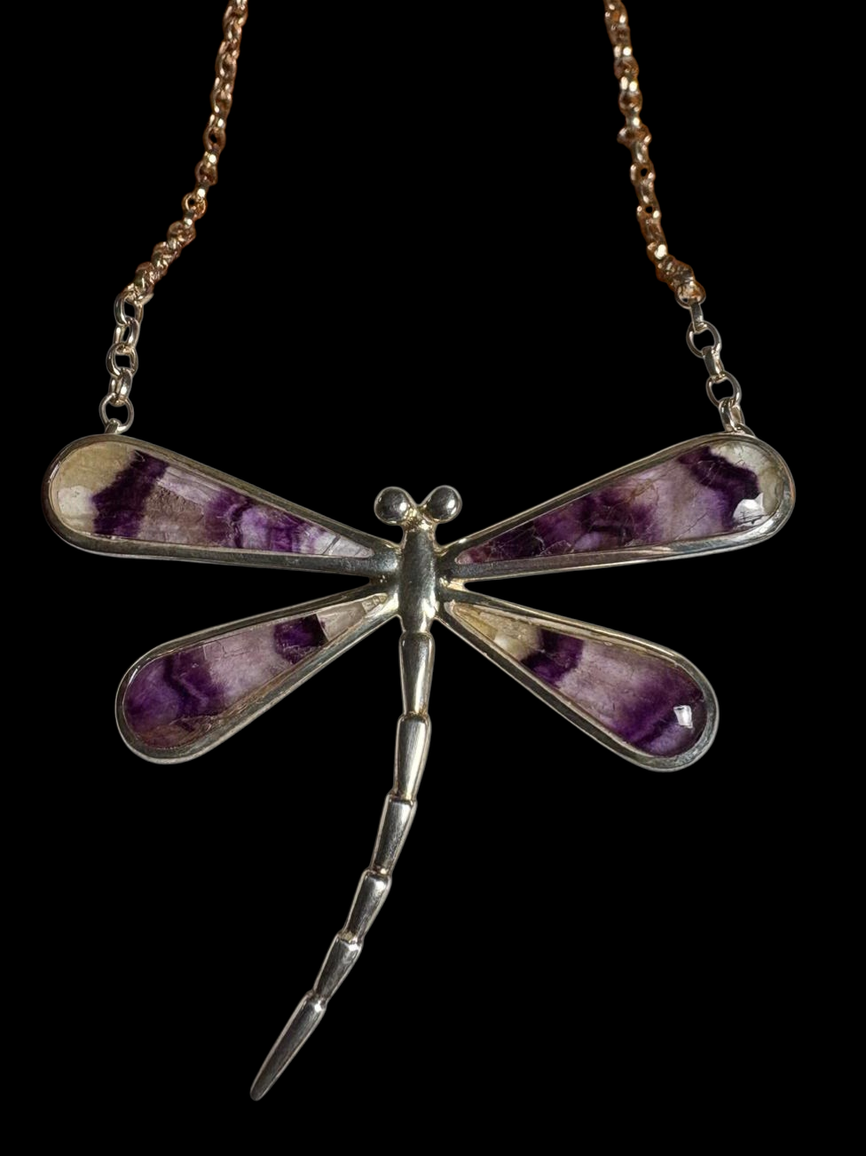 Handmade Large Blue John Dragonfly Necklet set in sterling silver, the Blue John is back with Mother of Pearl and has a solid silver back