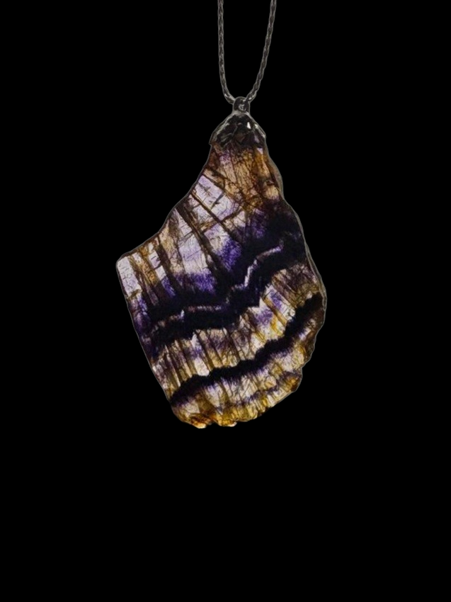 One of a kind, polished piece of Blue John perfect for hanging in the window or in front of a light.