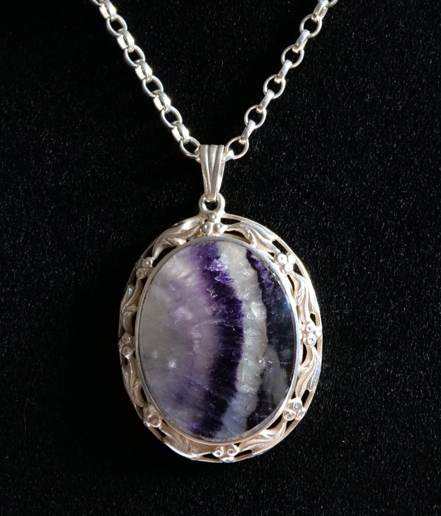 Large Handmade Oval Sterling Silver and Blue John Pendant backed with Mother of Pearl