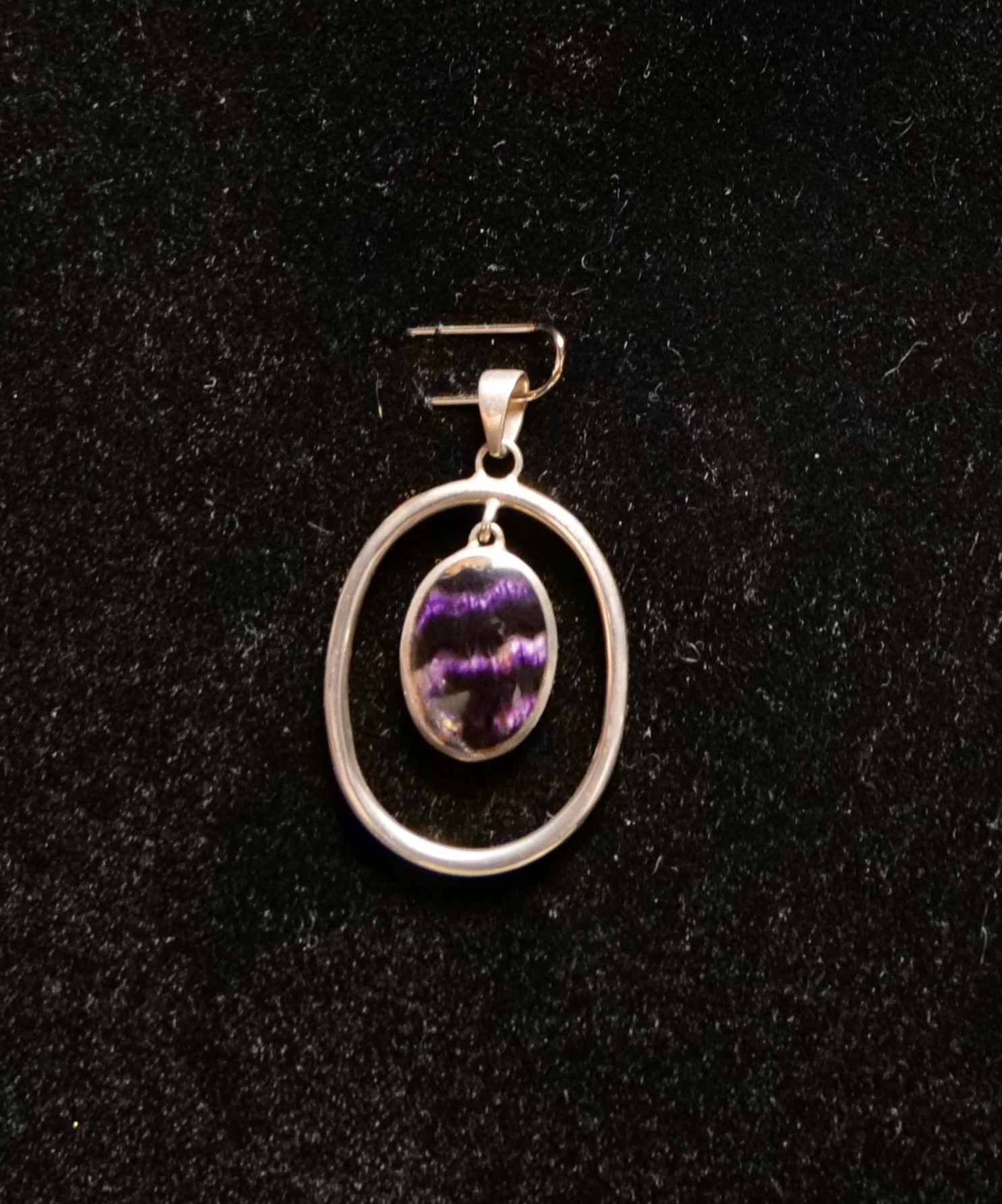 Sterling Silver Oval shaped drop pendant with central hanging Blue John Stone