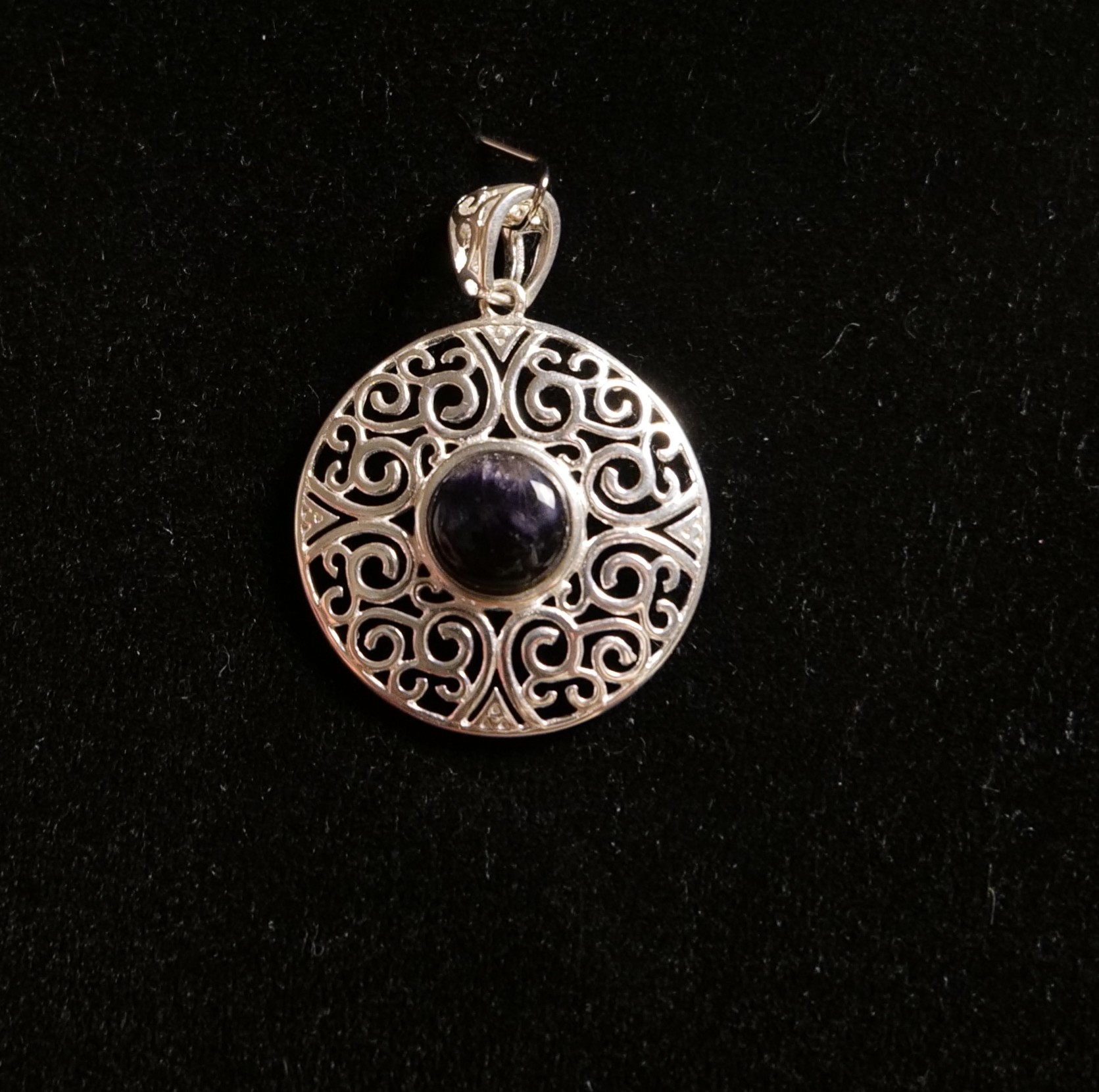 Large round Sterling Silver pendant with round Blue John stone, open backed