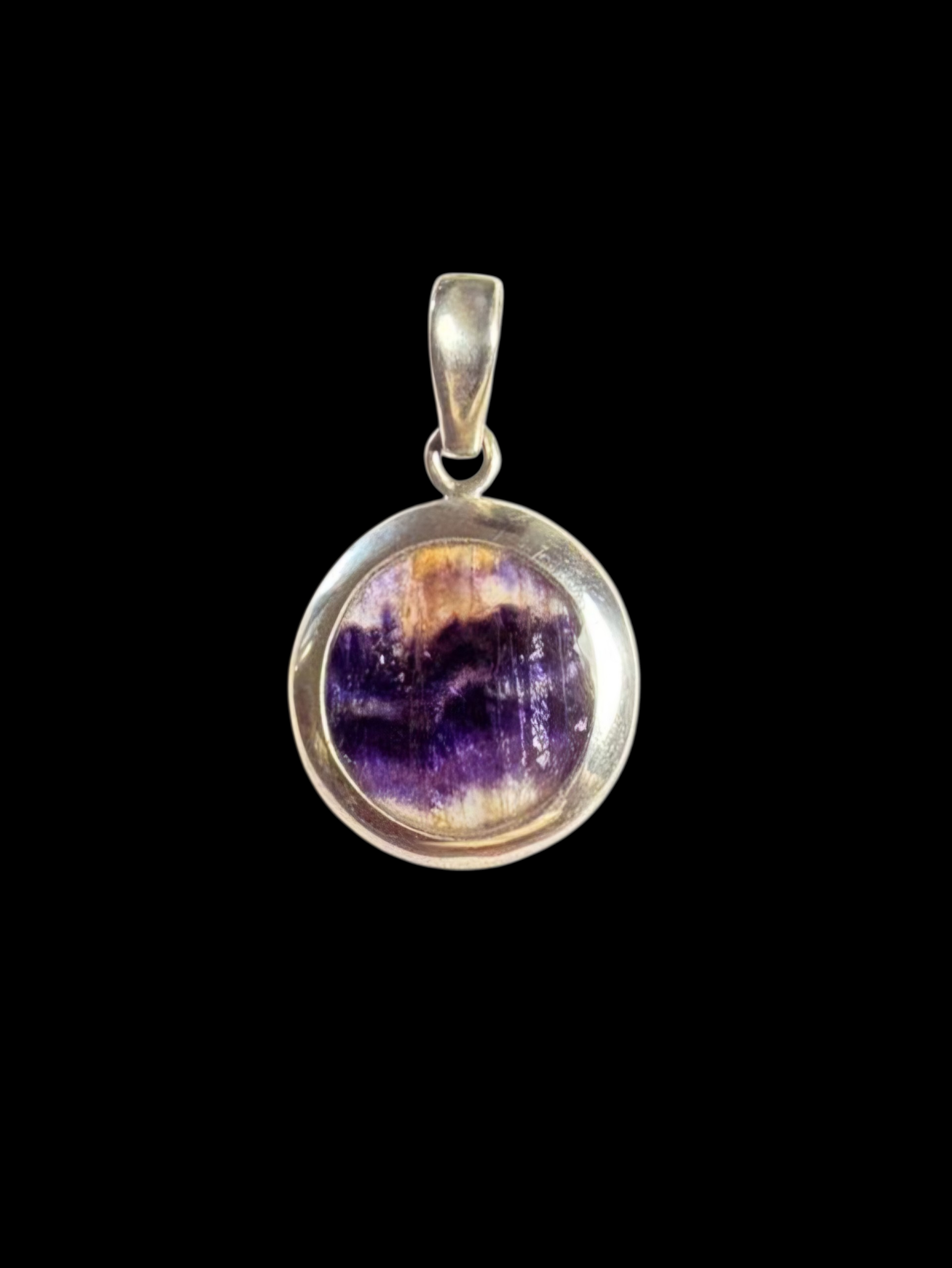Medium round Sterling Silver modern style Blue John pendant, solid backed