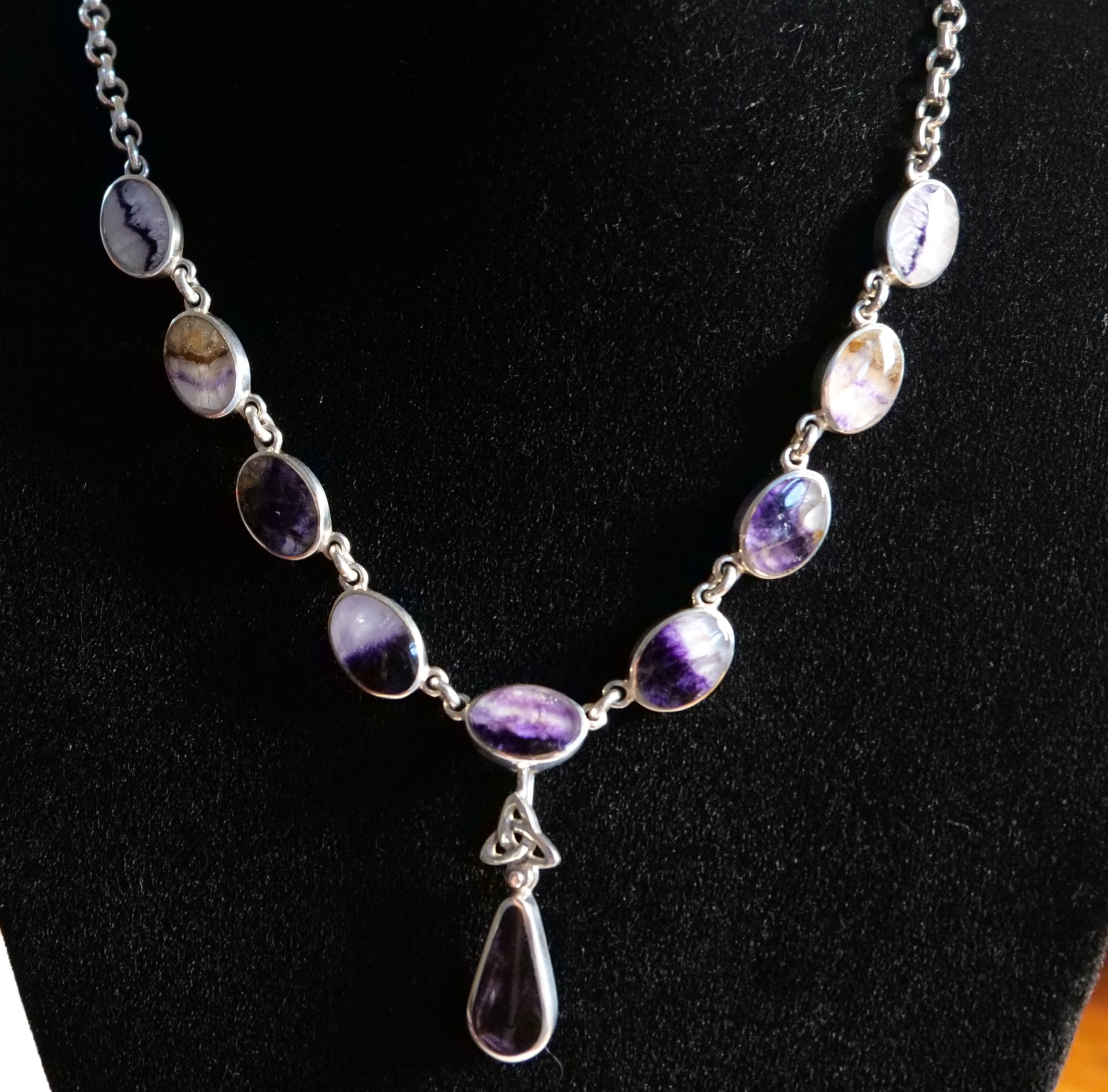 Handmade Sterling Silver and Blue John 9 Stone Necklet with detachable drop charm with small celtic design
