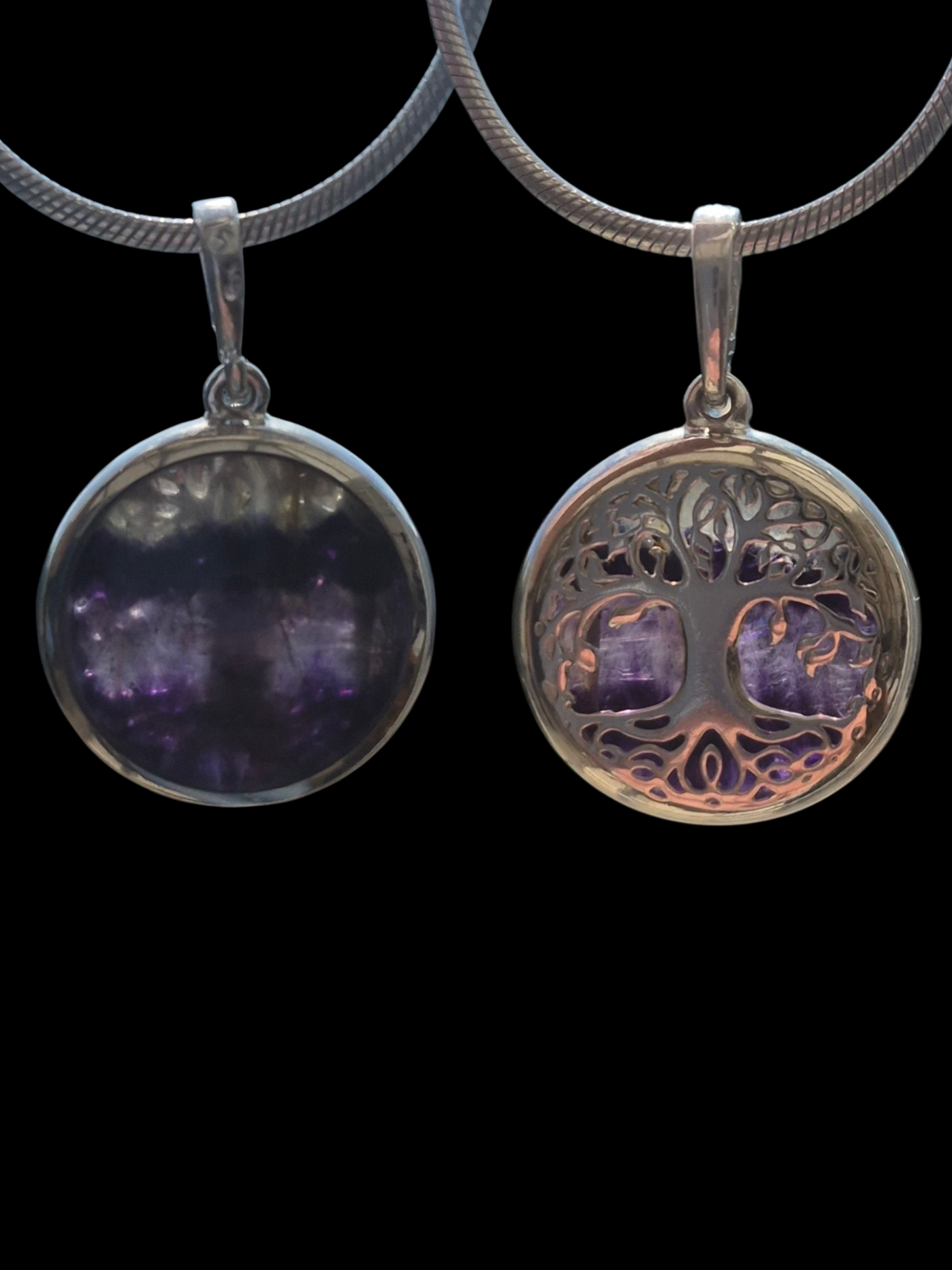 Sterling silver Tree of Life pendant set with Blue John Stone, this is a double sided pendant which can we worn either way.